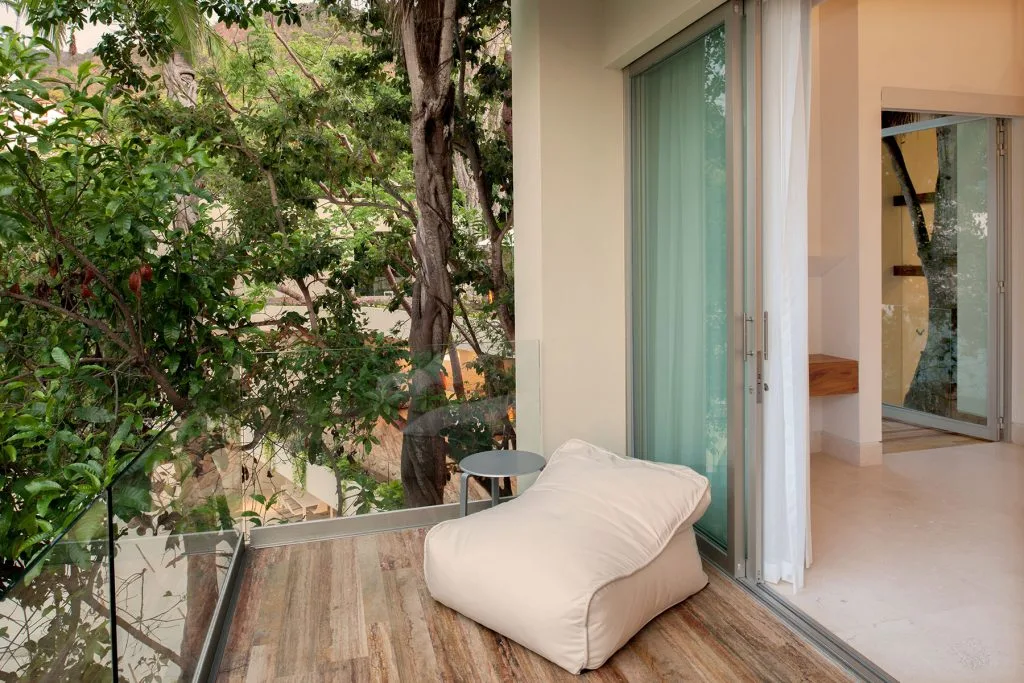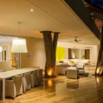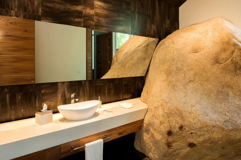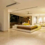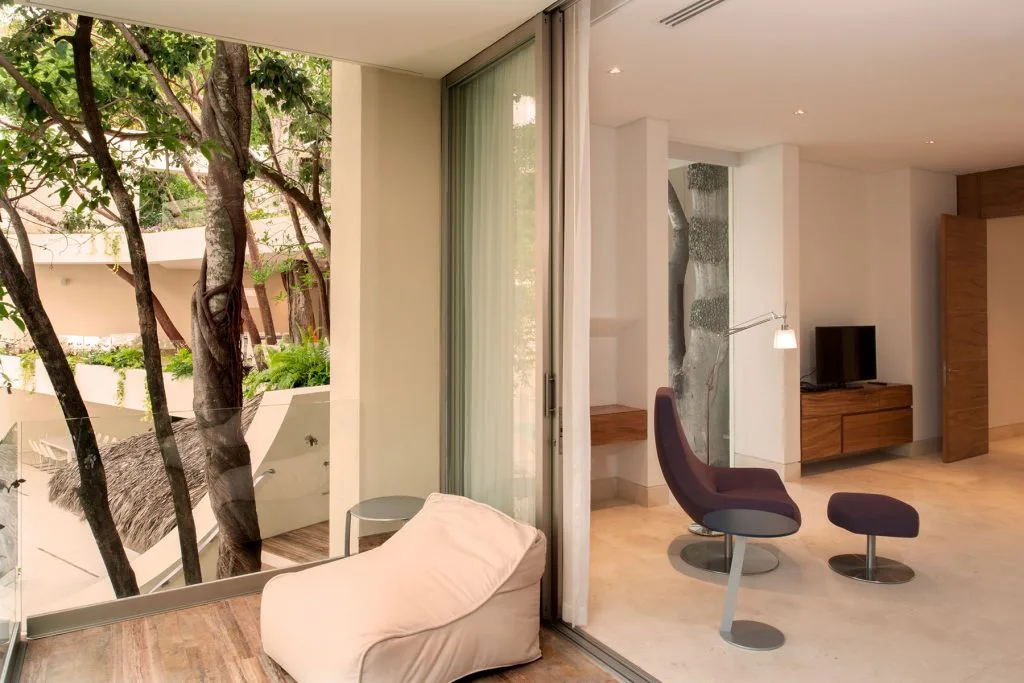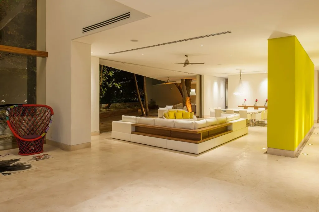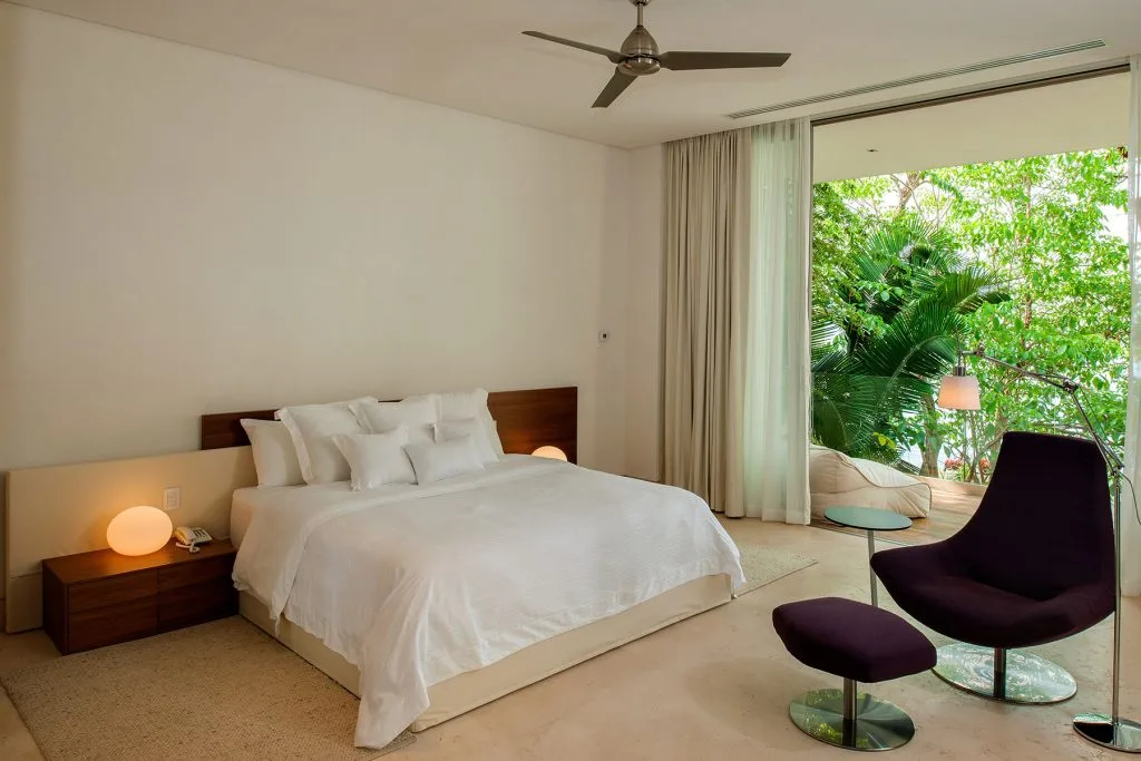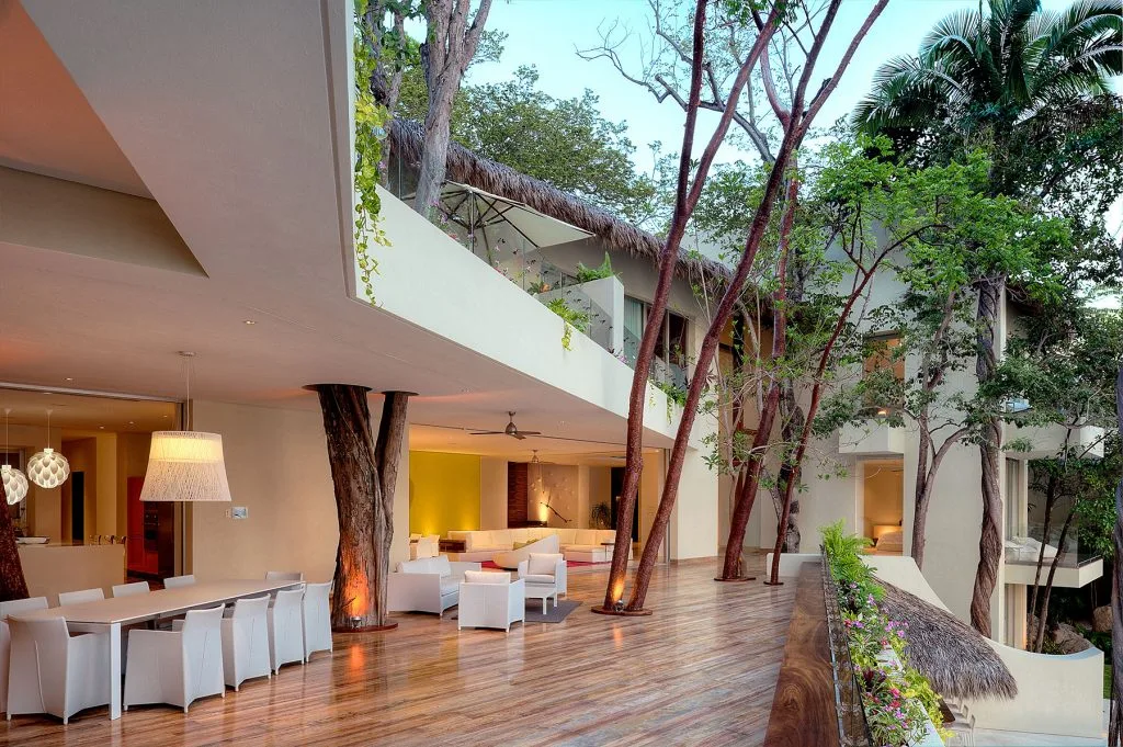 Casa Papelillos is a unique mix of sleek contemporary furnishings and natural features. Trees growing through the oceanfront balconies have been left intact, making the open-plan living areas feel as though they’ve grown out of the landscape. In the living room, clean-lined white seating is cool and modern, while pops of color like a red carpet and yellow cushions add a whimsical touch. A statement stone dining table has room for twelve, and the fully equipped kitchen has a spacious breakfast bar.