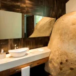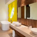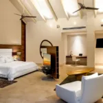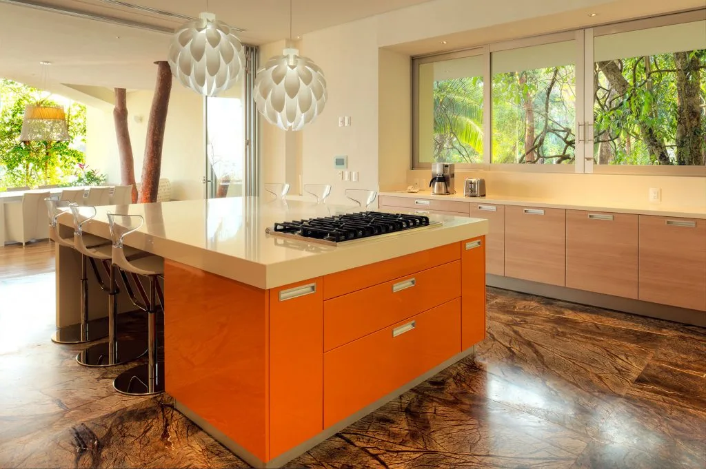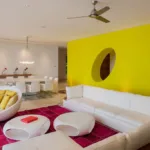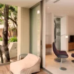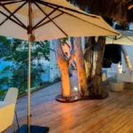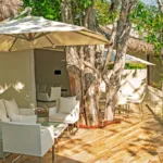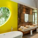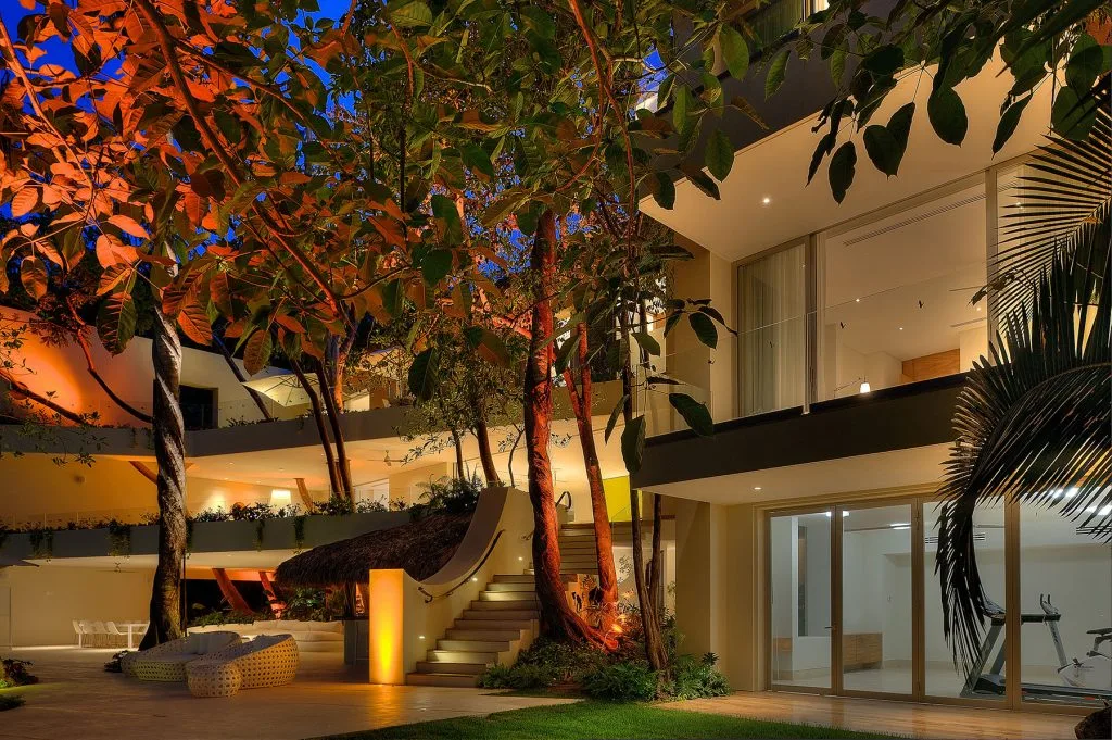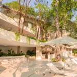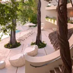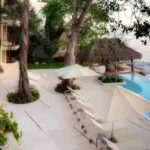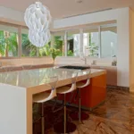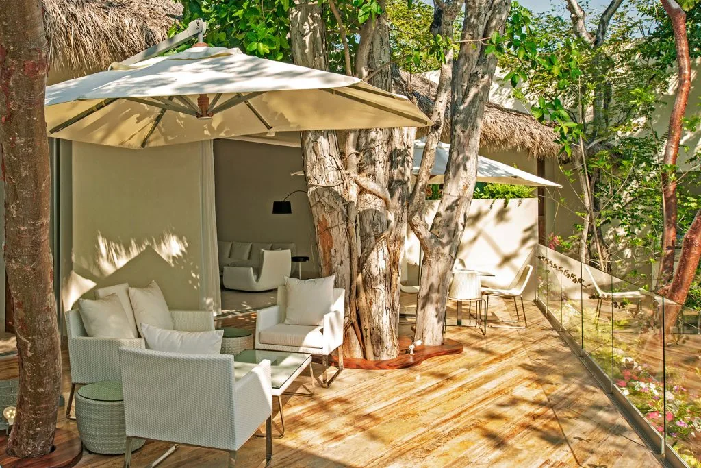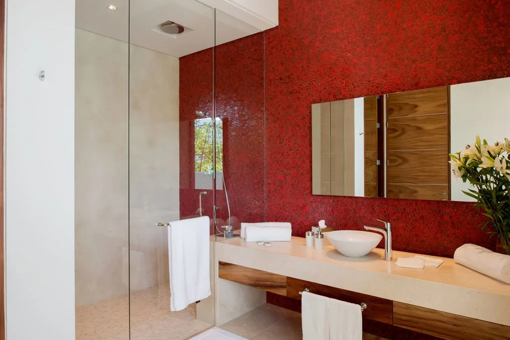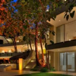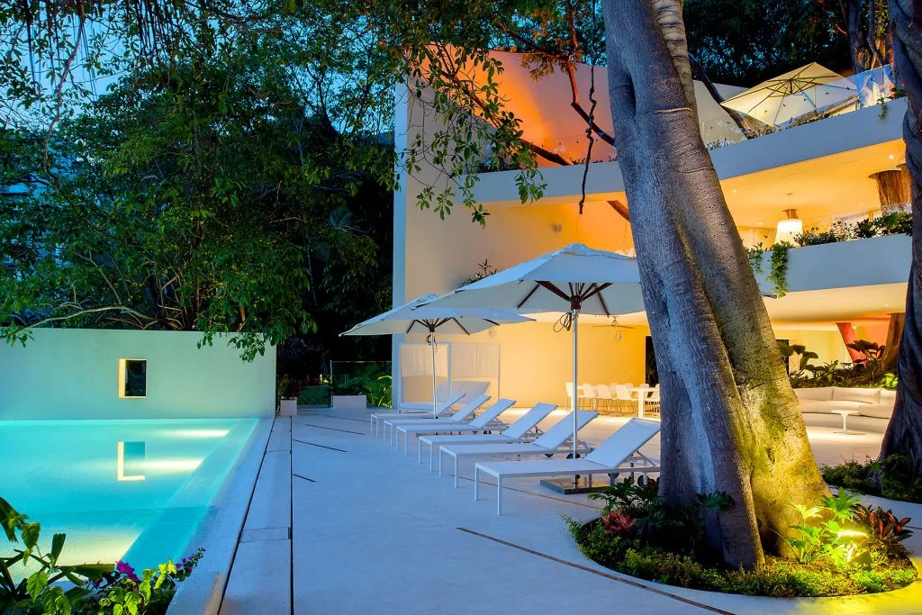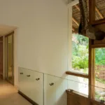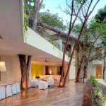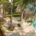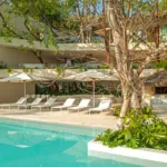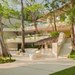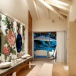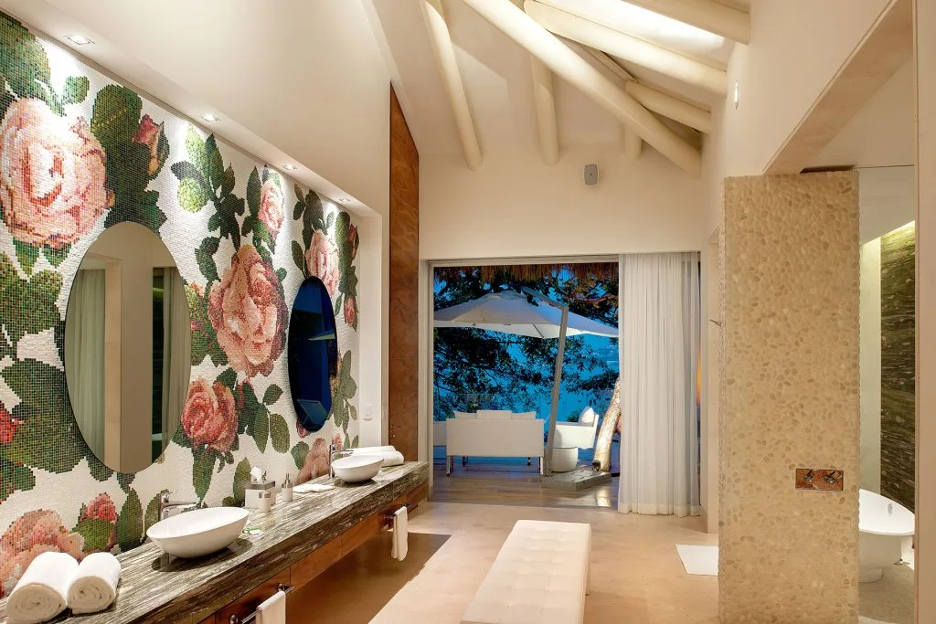 Casa Papelillos is a unique mix of sleek contemporary furnishings and natural features. Trees growing through the oceanfront balconies have been left intact, making the open-plan living areas feel as though they’ve grown out of the landscape. In the living room, clean-lined white seating is cool and modern, while pops of color like a red carpet and yellow cushions add a whimsical touch. A statement stone dining table has room for twelve, and the fully equipped kitchen has a spacious breakfast bar.