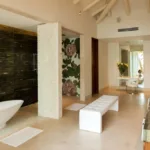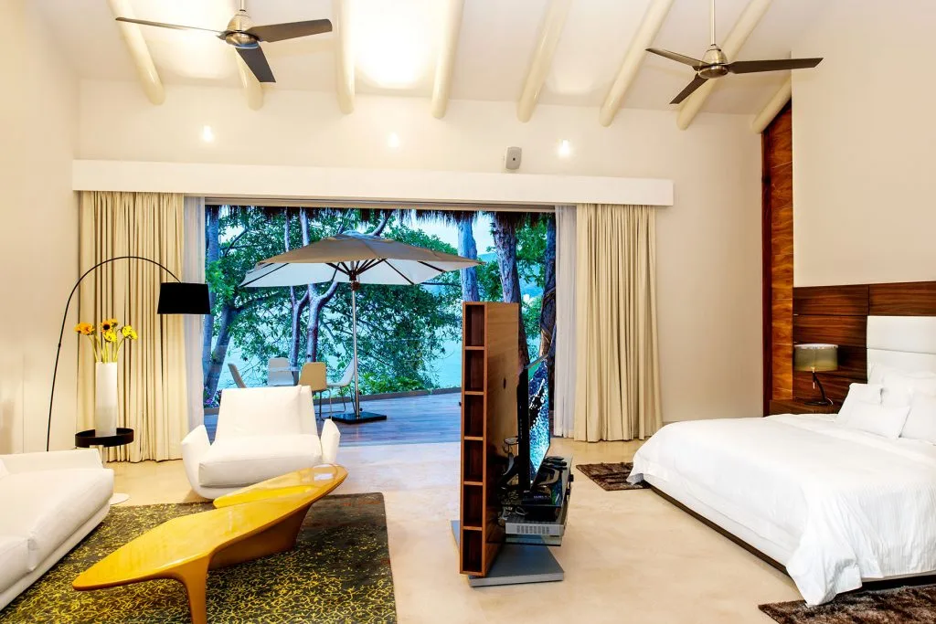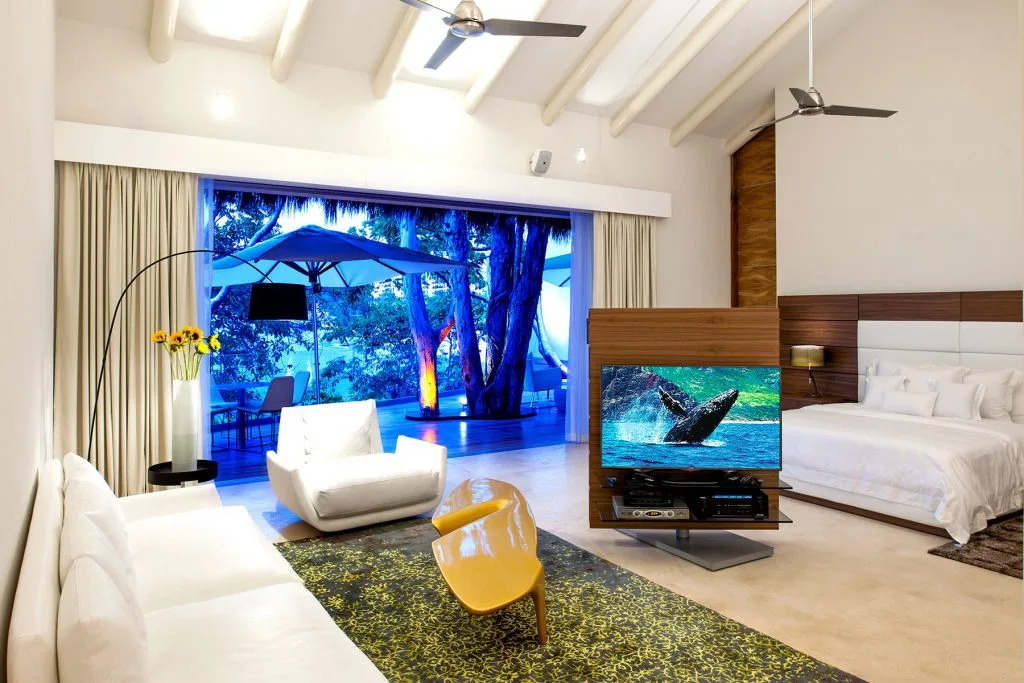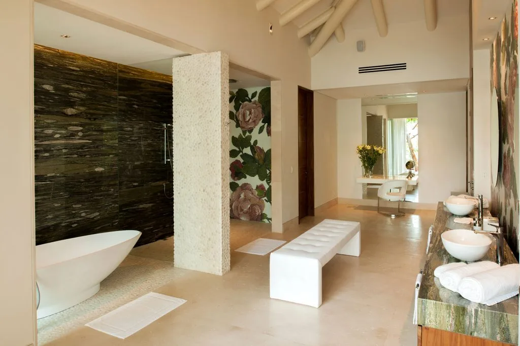 Each of the villa’s five bedrooms has an en-suite bathroom, in-room air conditioning and a ceiling fan. There are two bedrooms with king beds, walk-in closets and ocean views; one has access to a terrace and the other opens to a balcony. A third bedroom has two queen beds, a walk-in closet and a balcony, and the fourth bedroom has a queen bed, double bed, trundle bed, walk-in closet, sitting room and oceanfront balcony. The fifth bedroom has two twin beds, a sitting area, kitchenette and a small terrace. Additional bedding is available in the media room, where you’ll find a double Murphy bed.